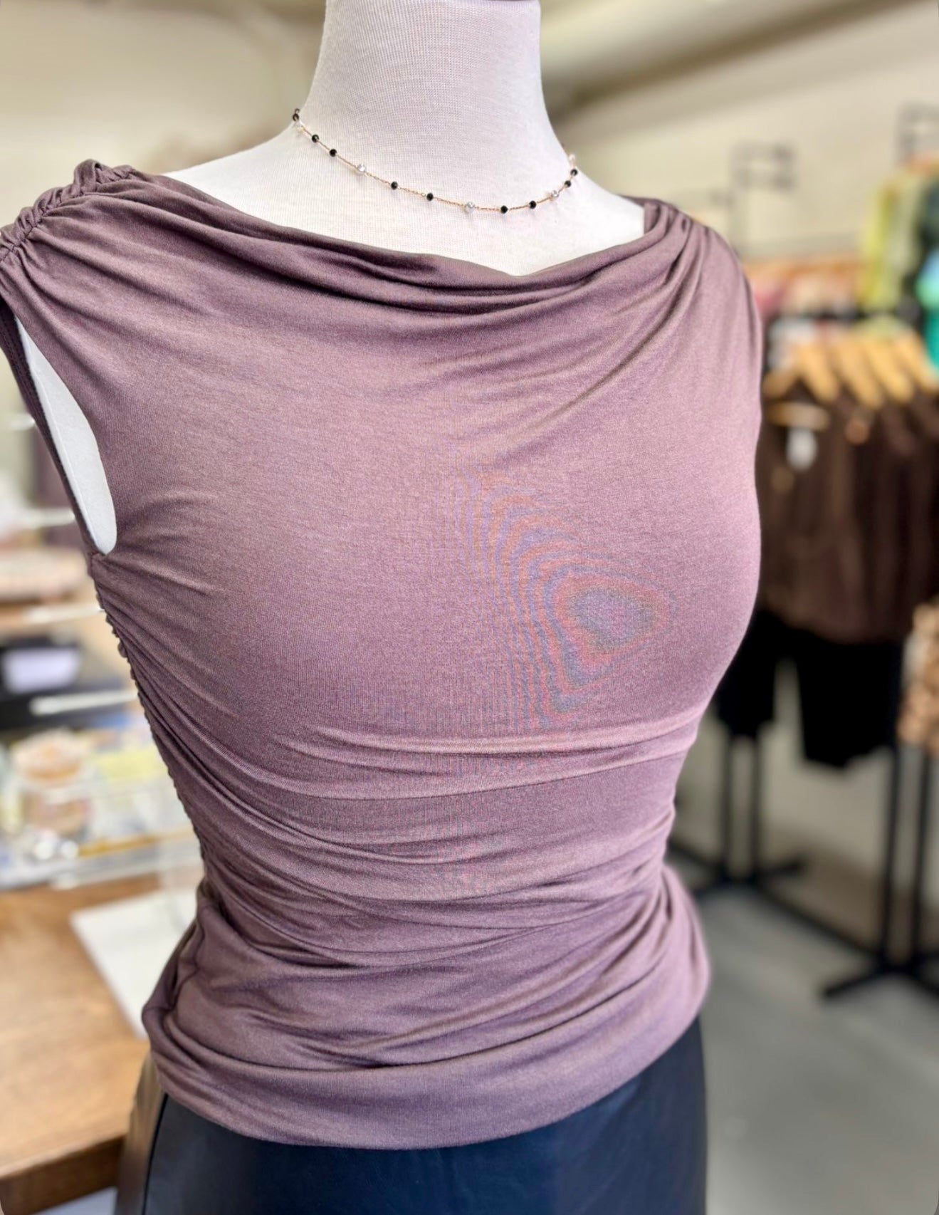 Introducing the Brunette Top - a sleek, one shoulder top that exudes chic and femininity. Made from a soft stretch fabric, this top offers a flattering fit that will elevate any outfit. The rouched detailing adds a touch of style to this versatile piece. Upgrade your wardrobe with the Brunette Top!