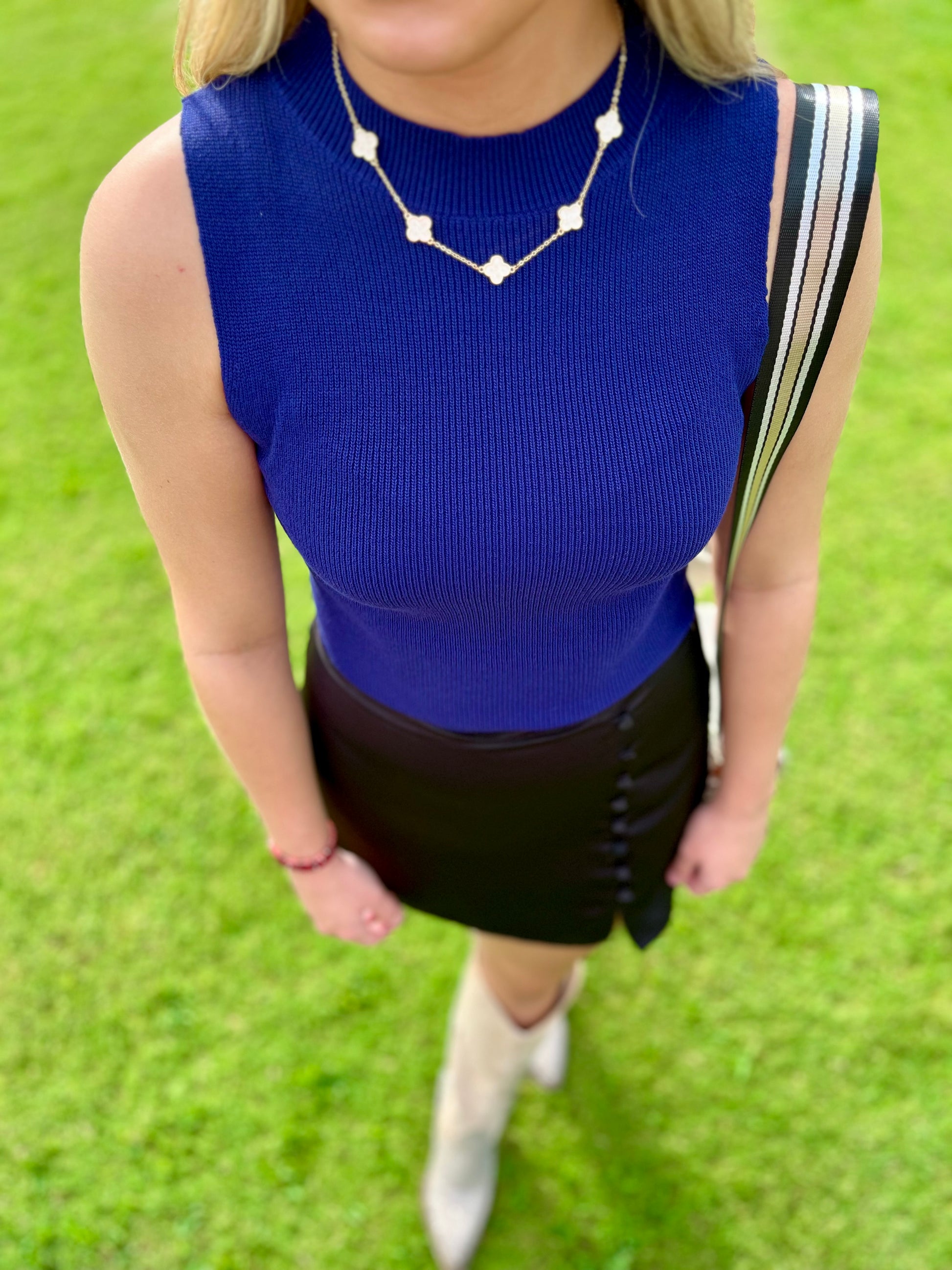 Get ready for game day with the Brynlee Tank in navy! This knit top features a trendy sleeveless design and a preppy aesthetic. Whether you're cheering from the stands or tailgating, this tank will keep you stylish and comfortable. Go team!