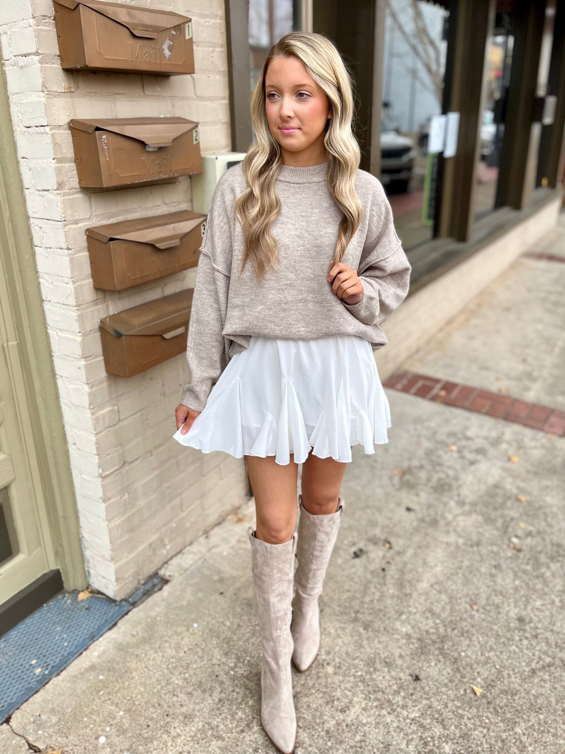 Expertly crafted from lightweight chiffon, this white mini skirt features a ruffle hem for added movement and an elastic waist for a comfortable fit. Elevate your wardrobe with this must-have piece that effortlessly combines style and comfort.
