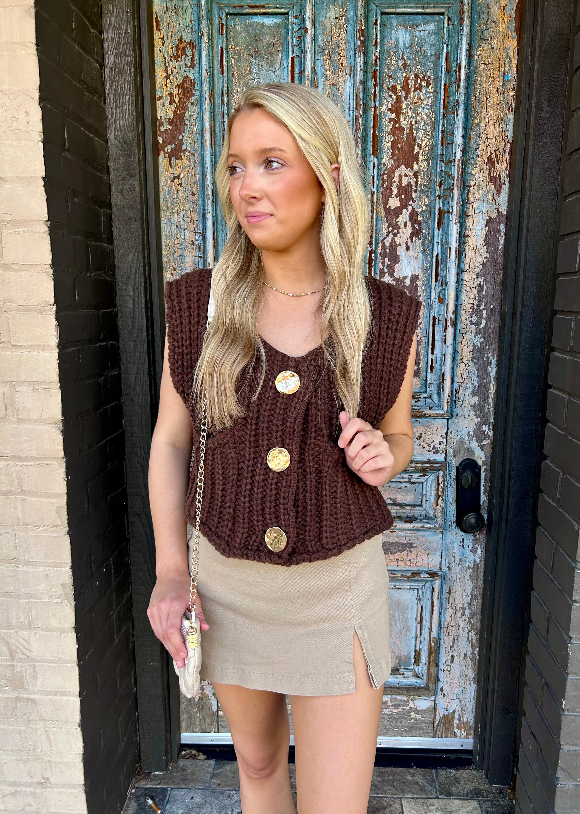 Experience cozy comfort and effortless style with our Chocolate Knit Sweater Vest. Made with a chunky knit, this sweater vest is perfect for layering and features stylish gold button details for added flair. Its cropped fit adds a modern touch to any outfit.