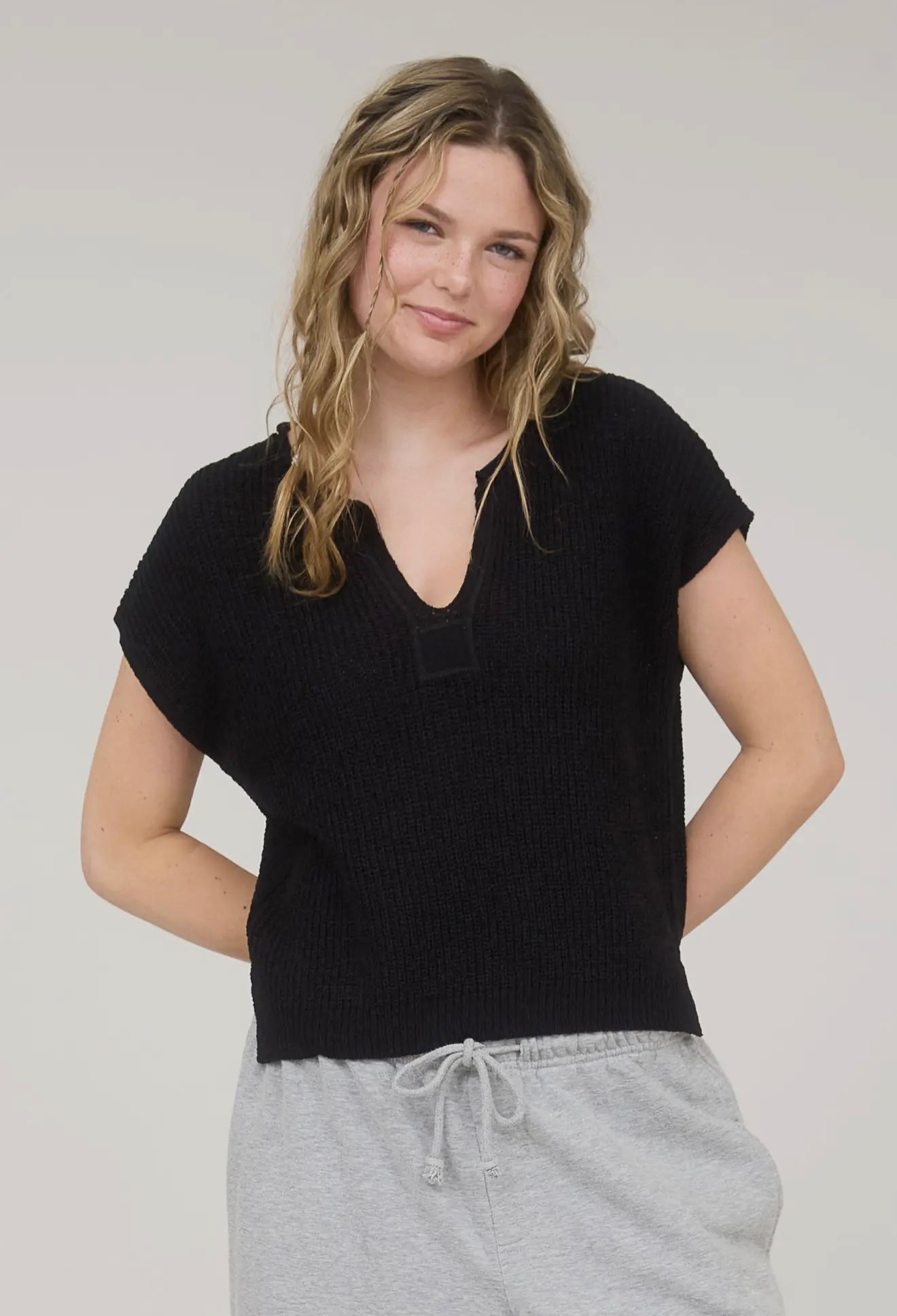 Expertly crafted with a split neckline and short sleeves, our Knit Pullover in Black is the perfect year-round staple. Made with a solid sweater knit, this top offers both style and comfort. Upgrade your wardrobe with this essential piece that effortlessly transitions from season to season.