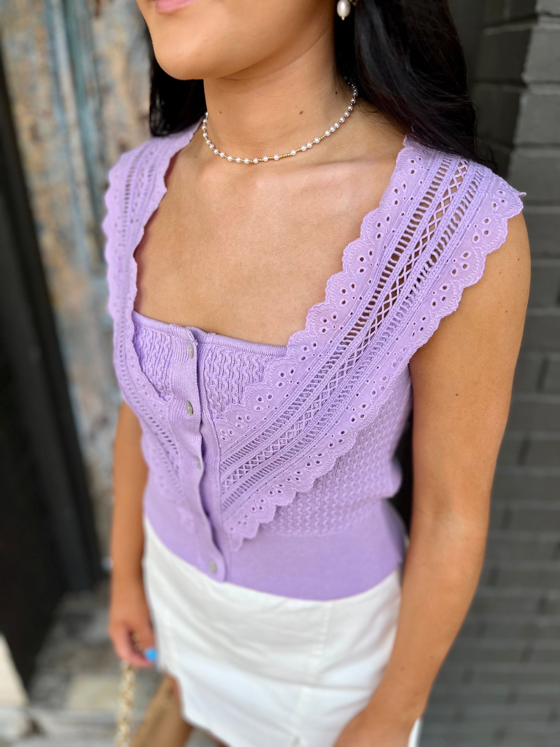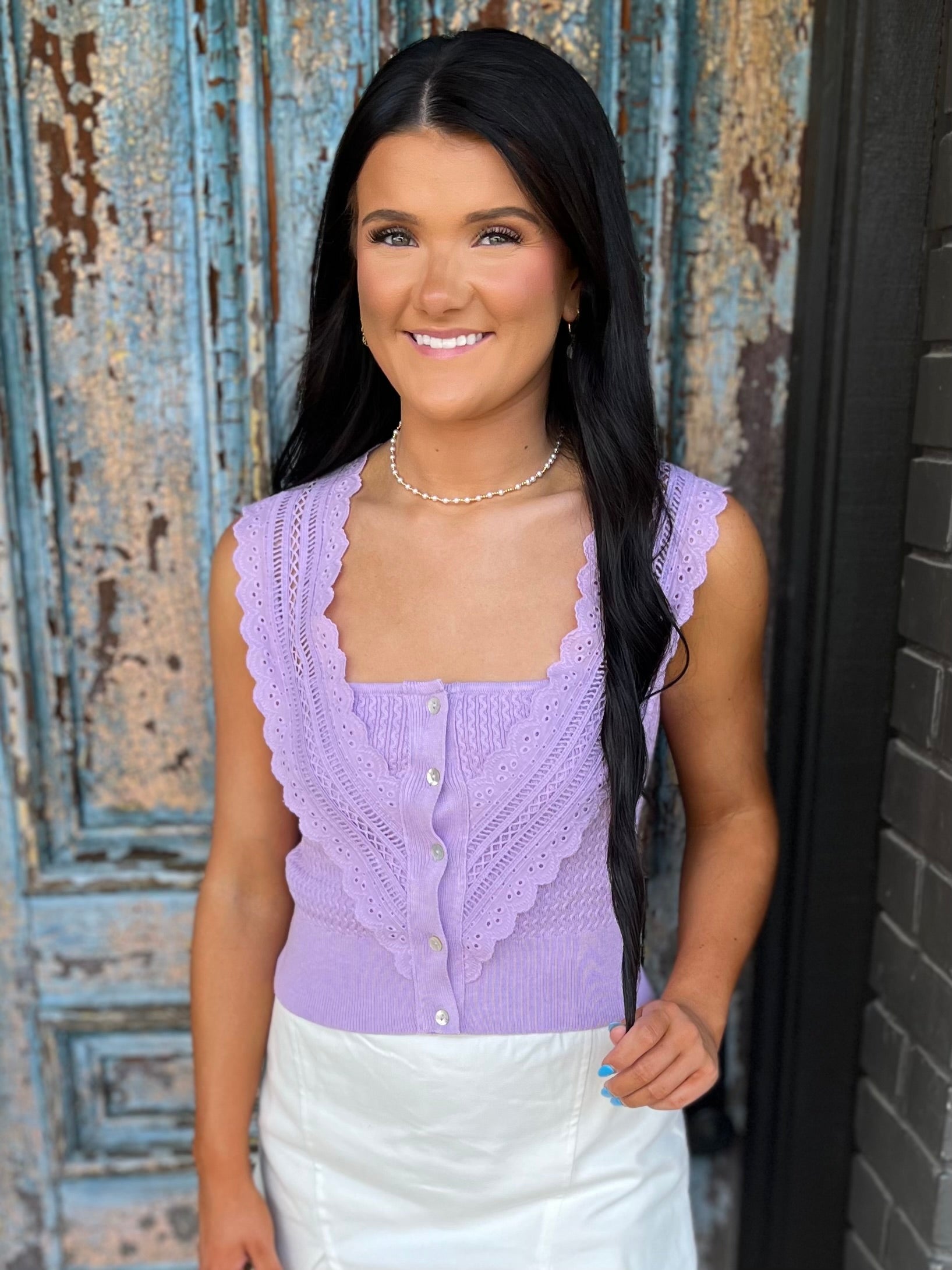 This lavender knit tank top features a v-neck and delicate lace, perfect for dressing up or down. The button-up design adds versatility and convenience for effortless styling. Stay on trend and comfortable with this must-have addition to your wardrobe.
