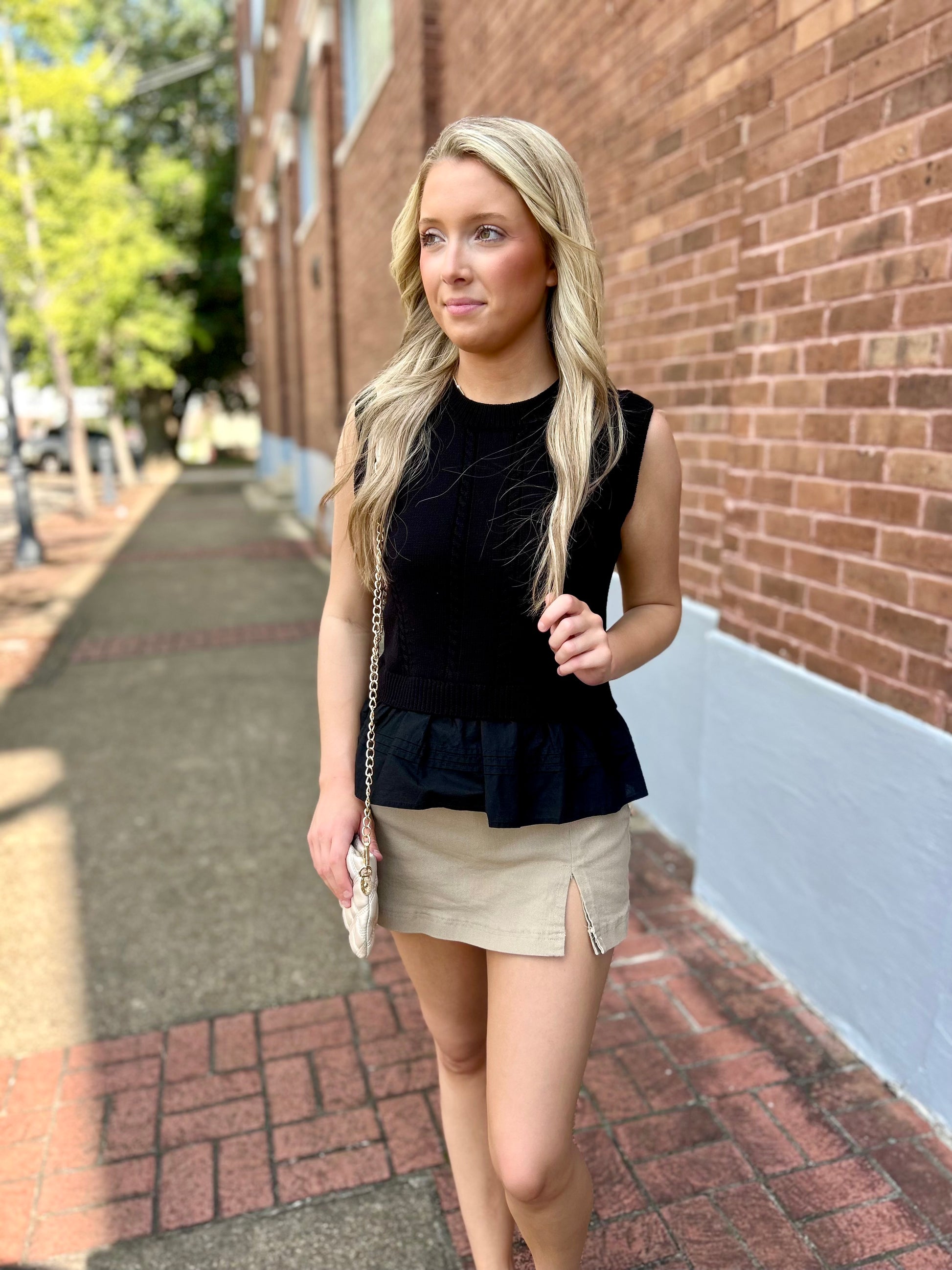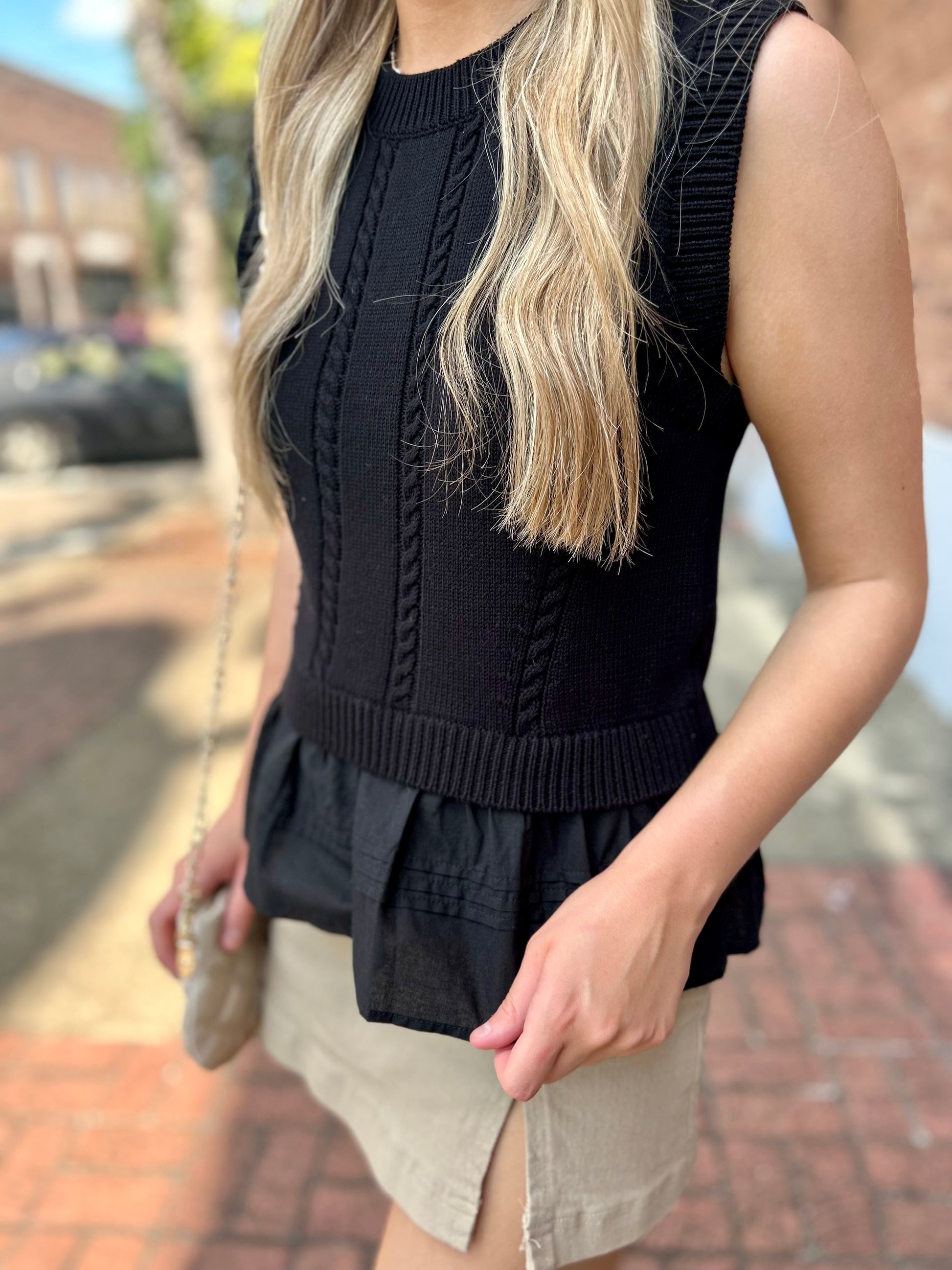 Our mixed media sweater vest features a unique ruffle hem, adding a touch of elegance to your wardrobe. Made with a blend of materials, this versatile top can be dressed up or down for any occasion. Elevate your style with this fashion-forward piece.