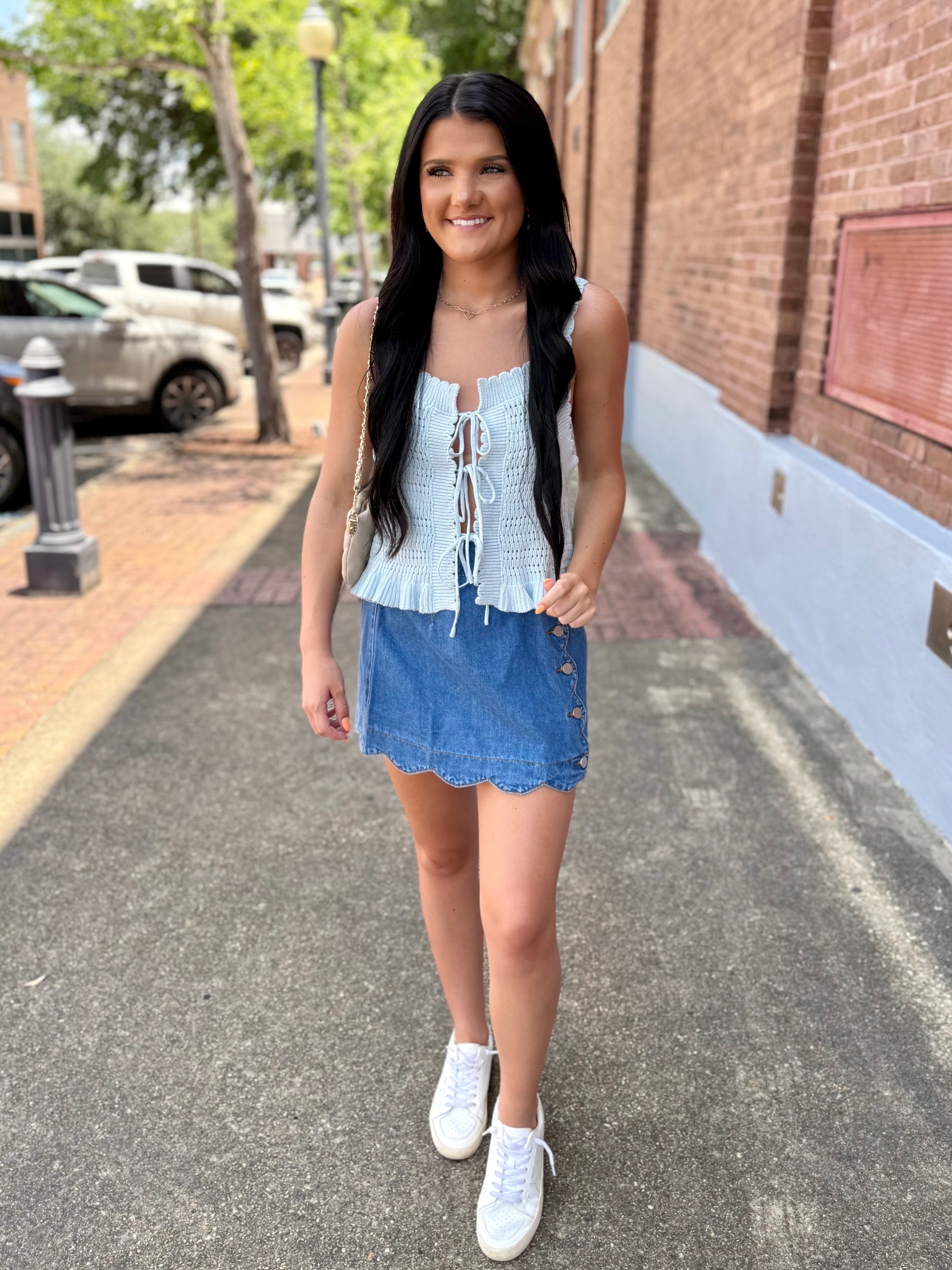 Experience the versatility of our Reversible Knit Top in Blue. Made from a crochet knit, this square neck top can be worn with either side showing. Style with the self tie and ruffle hem for a trendy crop top look. Perfect for any fashion-forward individual!